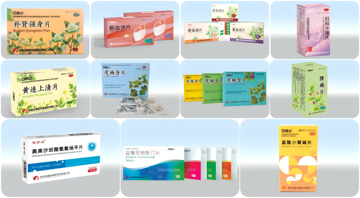 片剂 中成药:断血流片、虎梅含片、黄连上清片、妇科十味片、元胡止痛片等; 化学药:盐酸司他斯汀片(商品名:齐齐)、奥美沙坦酯氨氯地平片(商品名:优可达)、盐酸小檗碱片等;